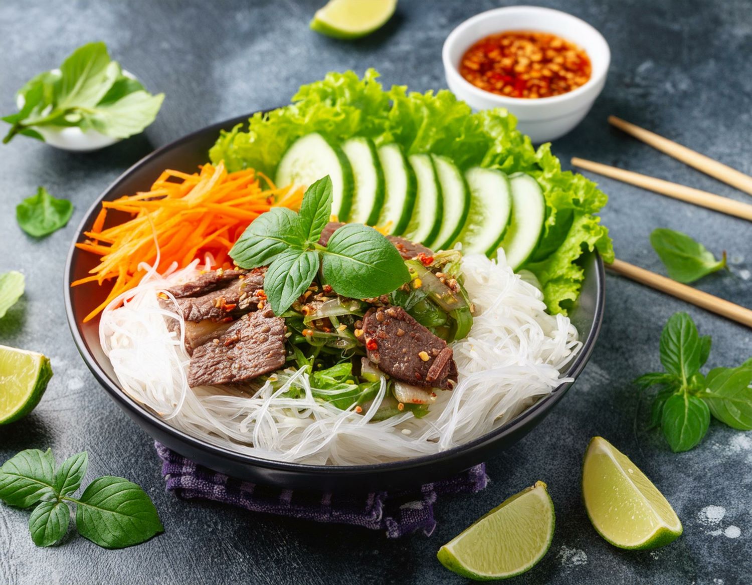 Le Bo Bun, qui se traduit littéralement par « vermicelles de bœuf », est un plat typique du sud du Vietnam, particulièrement populaire à Hô Chi Minh-Ville (anciennement Saïgon). Traditionnellement, il s’agit de vermicelles de riz servis avec des tranches de bœuf mariné et grillé, accompagnées de légumes frais, d’herbes aromatiques, de cacahuètes, de sauce nuoc-mâm (sauce de poisson fermentée), et parfois de nems. Ce plat se distingue par l’équilibre parfait entre la douceur du bœuf, le croquant des légumes et des herbes fraîches, la chaleur de la sauce et la texture fondante des vermicelles.